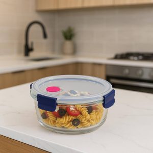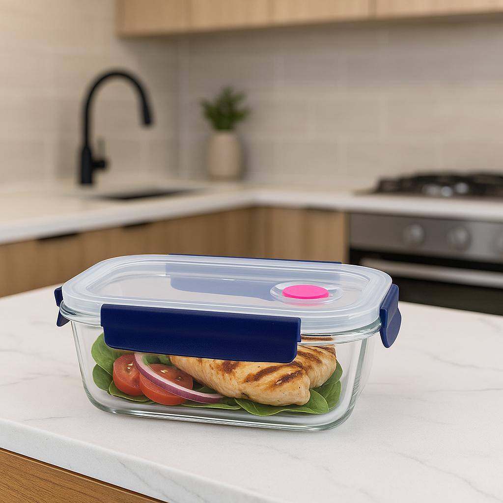 - Design: Transparent glass with navy-blue side clips & silicone seal
